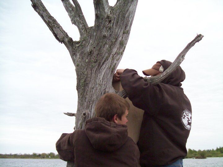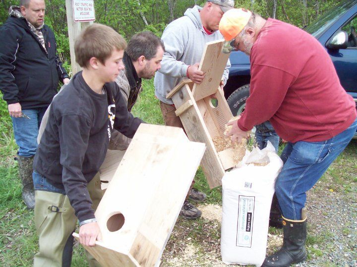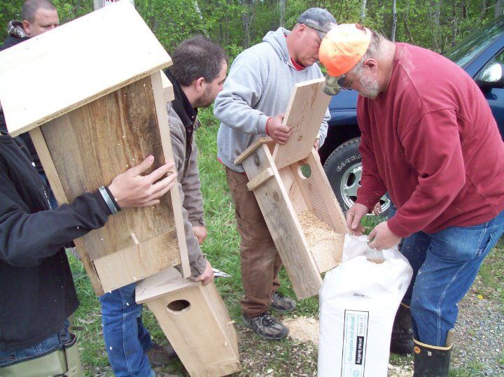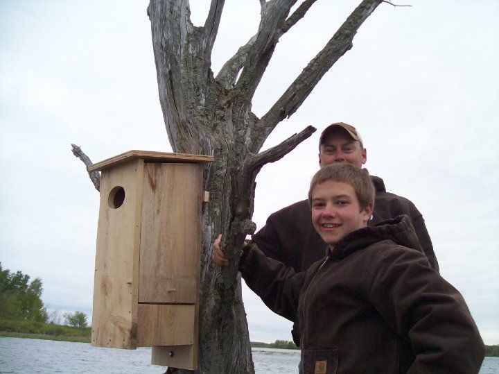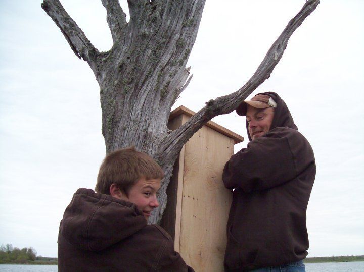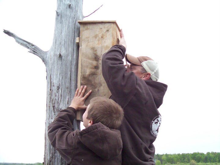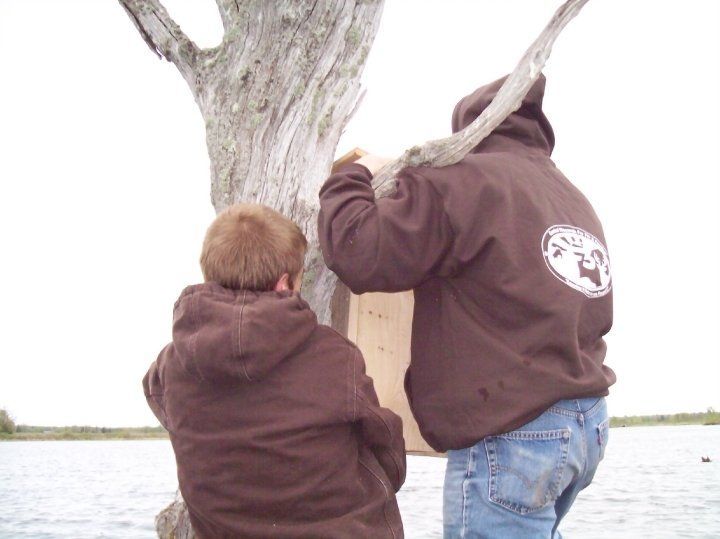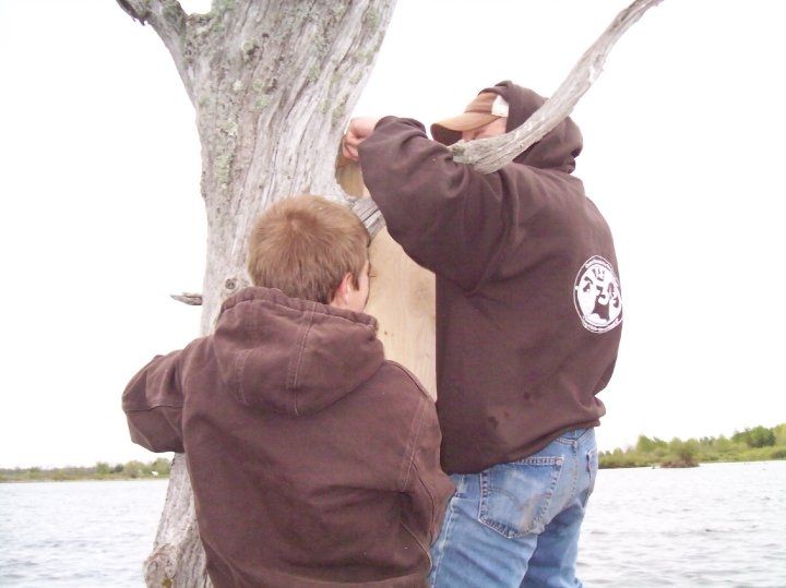 F3 friends and kids putting up new wood duck houses on the watershed